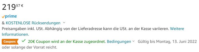 Auf den Preis kommt ihr durch den 20€ Click-Coupon auf der Artikelseite und den Einsatz des Gutscheincodes LAFLRU38 bei der Bestellung an der Kasse.
